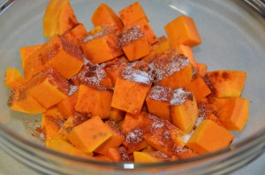Place butternut squash or sugar pumpkin in large bowl; toss with 2 tablespoons oil, cumin, paprika,and sea salt. Arrangebutternut squash in single layer on baking sheet; roast 15 minutes. Turn butternut squash over. Roast until tender, 10 to 15 minutes. Cool.
