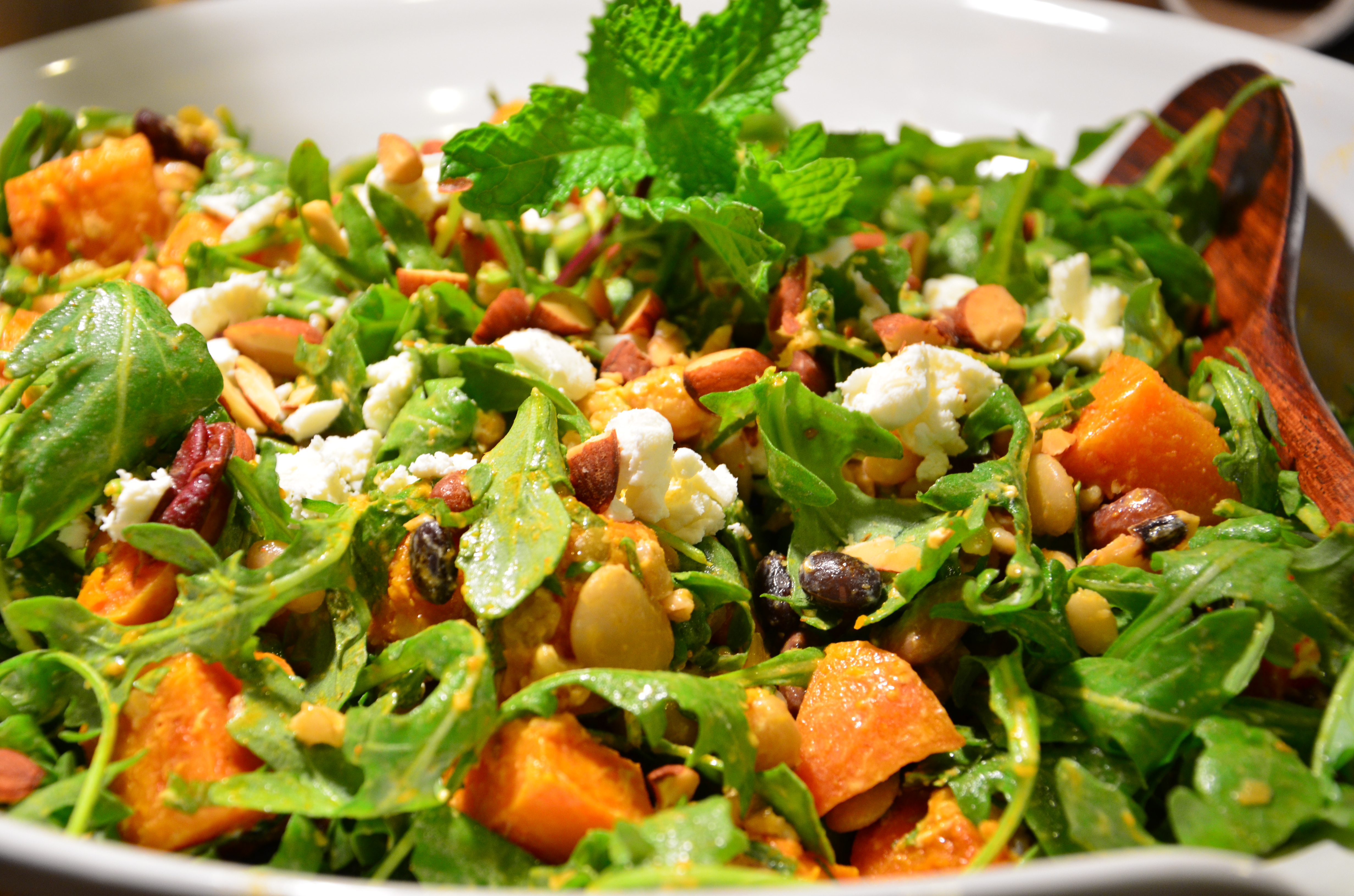 I love butternut squash. That’s why I was thrilled when my friend Jess shared a recipe she uncovered in a vintage Bon Appetit magazine that celebrates butternut squash in a harvest salad that is packed with mediterranean flavor! Typically, I roast butternut squash simply with sea salt and fresh ground pepper, but Bon Appetit’s recommendation to season the squash with fresh ground cumin and smoked Spanish paprika peaked my interest. It brings together some of the ingredients that I enjoy cooking with on a regular basis like arugula and goat cheese and tosses them together with some unexpected players like French green lentils and mint! The spices on the butternut squash and the mint really added an exotic flavor to a beautiful harvest salad.