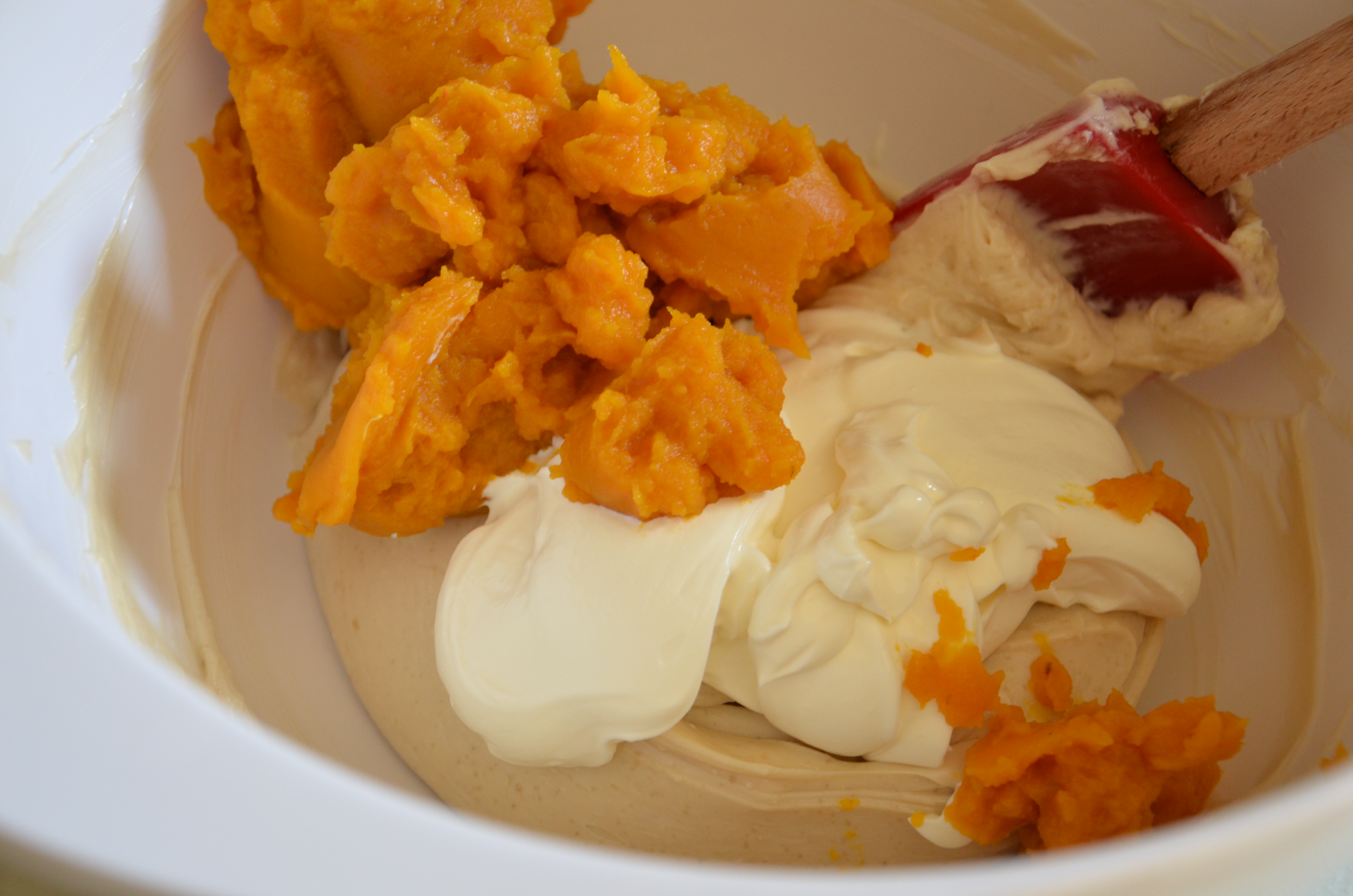- In a large bowl, beat cream cheese and brown sugar until soft and well blended, stir in the sour cream and pumpkin.