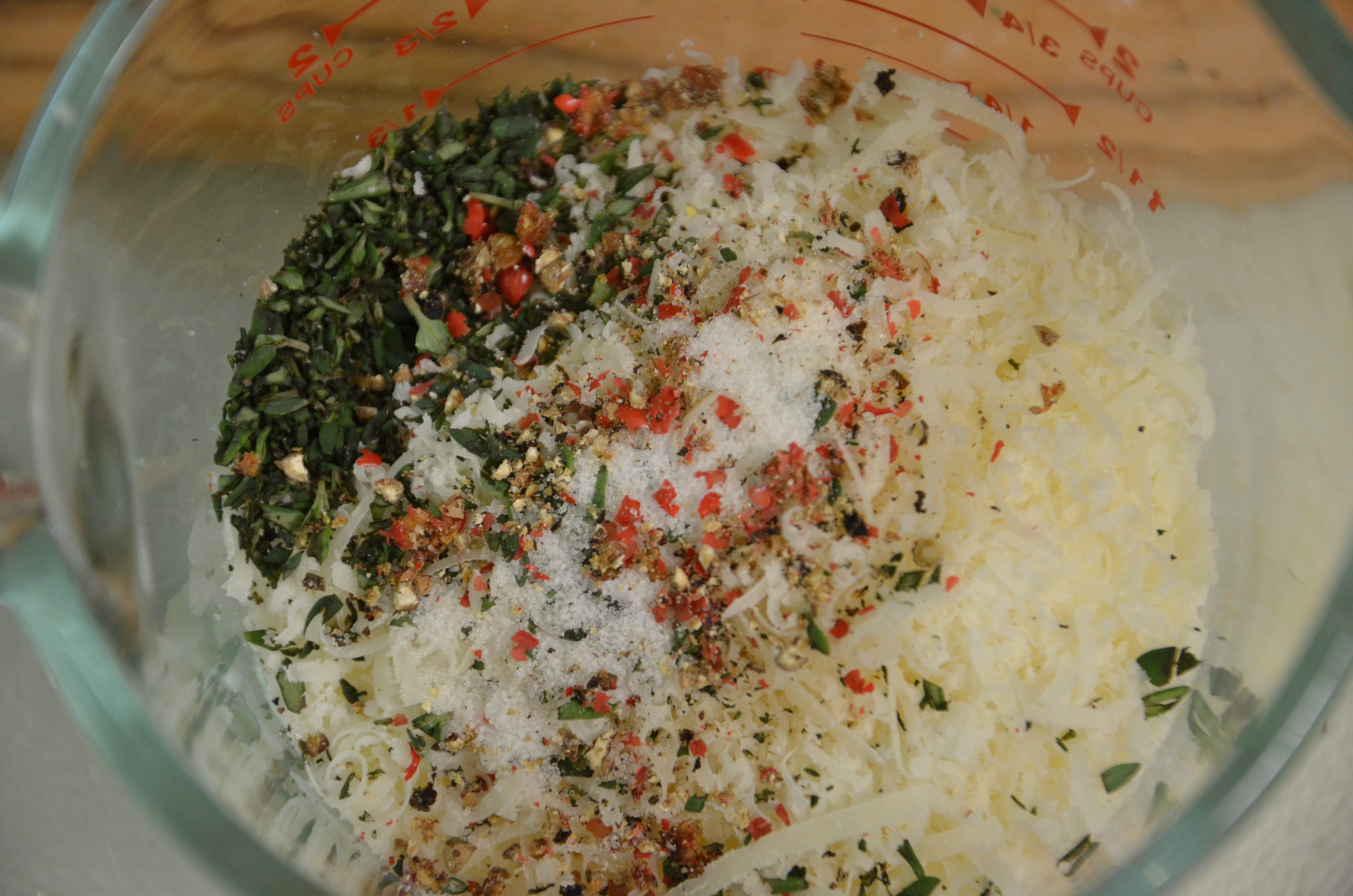1 cup hard cheese, finely grated (In this batch, I used 1/2 cup pecorino, 1/2 cup parmigiano)