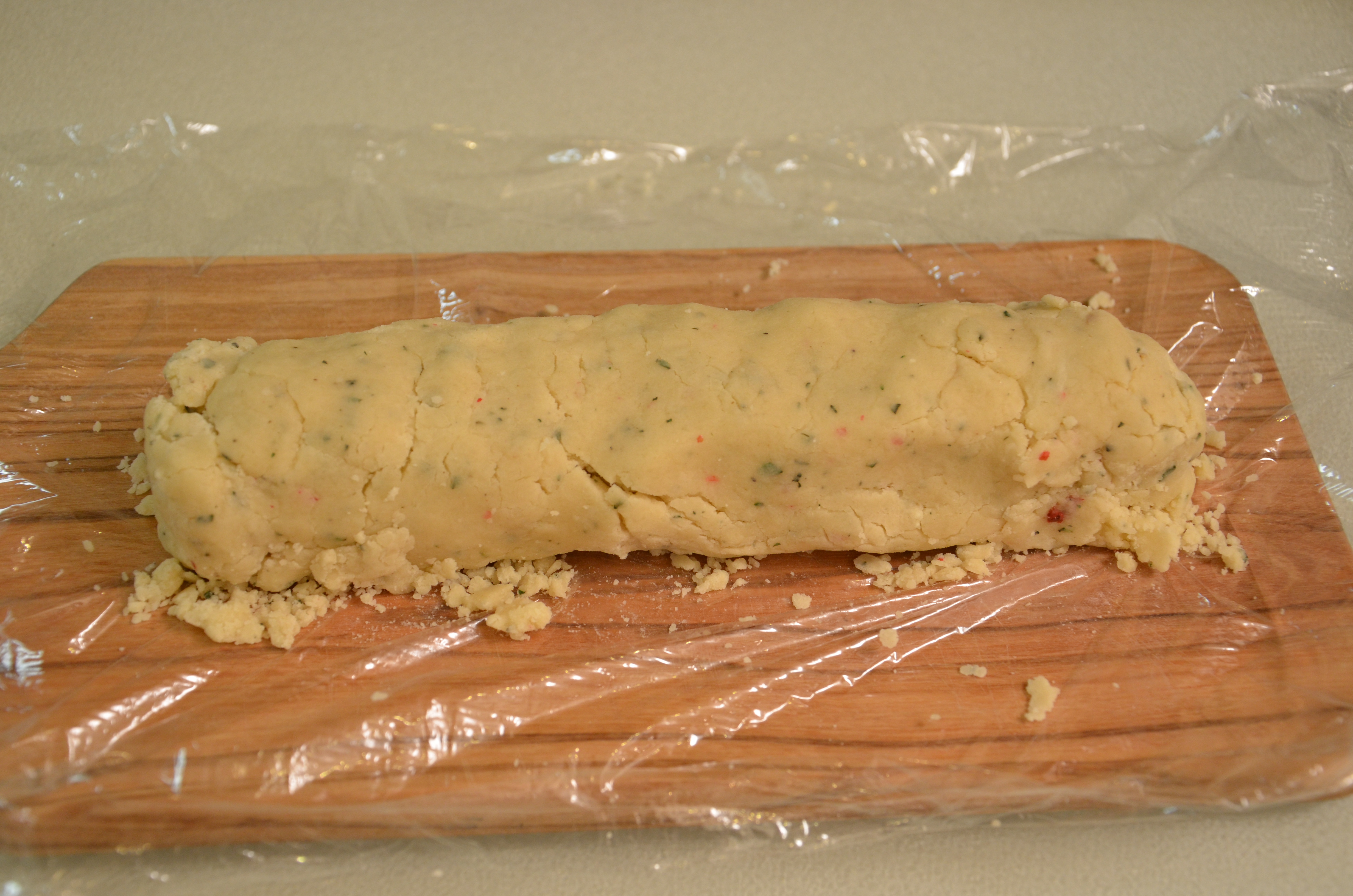 - Gently work ball into a 10″ long round log. If you plan to roll the dough in nuts, do so now.