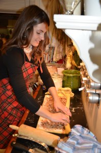 • Remove dough from the fridge and allow to warm slightly about 10 minutes to improve workability.  Place a lightly flowered work surface and roll to 1/4″ thickness and 15×20″.  Trim so edges are nice and straight.  * You can make a separate loaf with the remnant dough or use as a base for a gourmet pizza instead of traditional savory dough- apps the following night just covered!