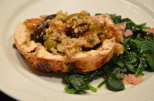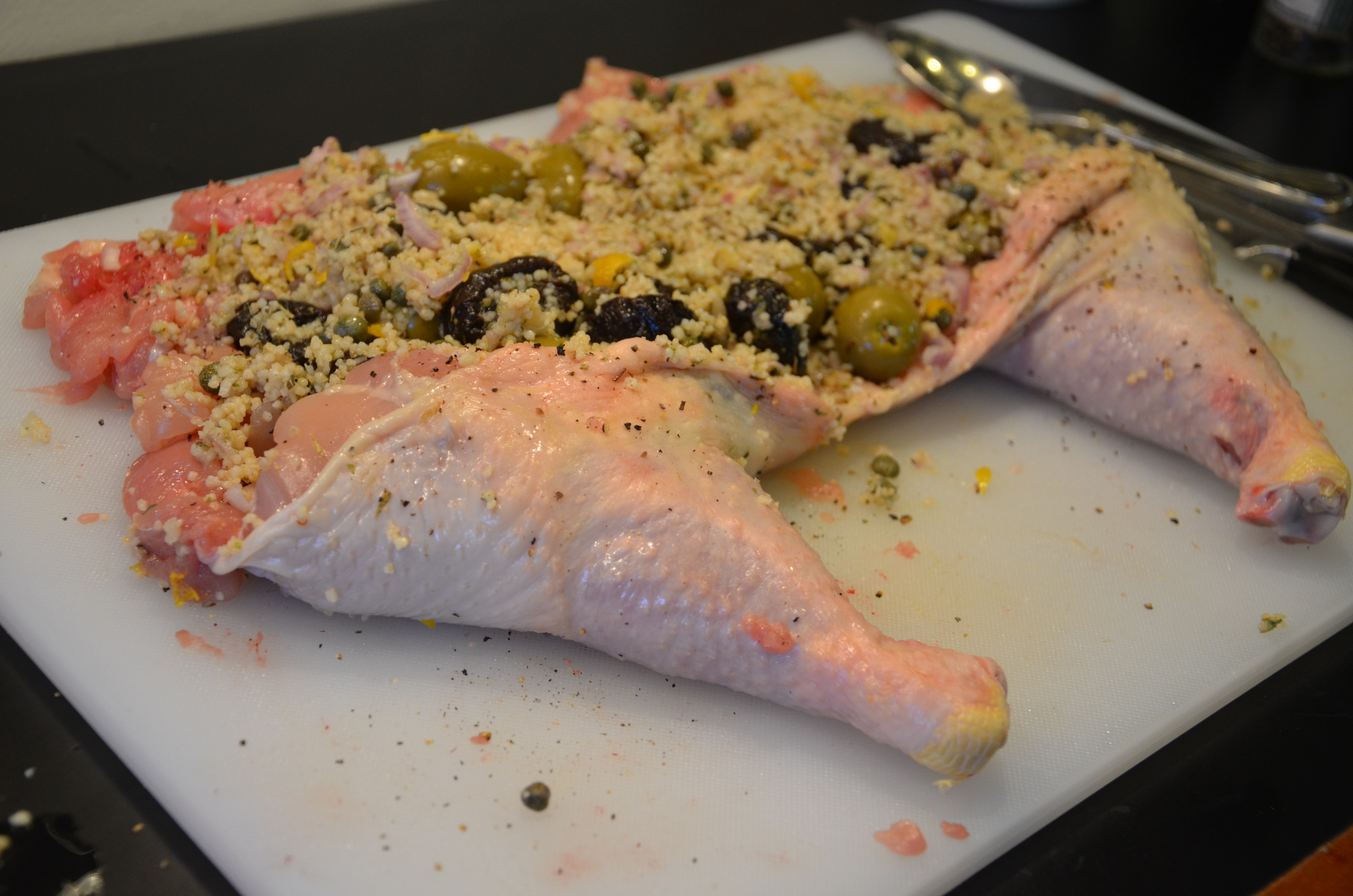 Most of my energy and enthusiasm went in to getting the darn bones out so when I was left finally with just the “Chicken Jacket” I had to quickly think of something to stuff it with.  All at once it came to me to make an Outside-In Chicken Marbella.  Yes, I felt very clever, though hardly original.  Chicken Marbella is the Gold Star dish that has earned The Silver Palate cookbook a place on so many of our shelves.  I had some left over couscous that I tossed with prunes, spanish olives, capers, shallots, lemon zest and garlic and I had my ballotine aka BUNDLE!