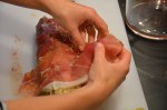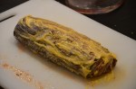 - Place on a sheet of parchment paper on a baking sheet, seam side down. Bast with a light egg wash (1 egg yolk, 1 Tbs whole milk, whisked) and bake for approx 25 minutes until temperature reads 125. Allow to rest a minimum of 10 minutes before slicing into 1 1/2″ medallions. Serve immediately with a fantastic bottle of Bordeaux. Cheers!