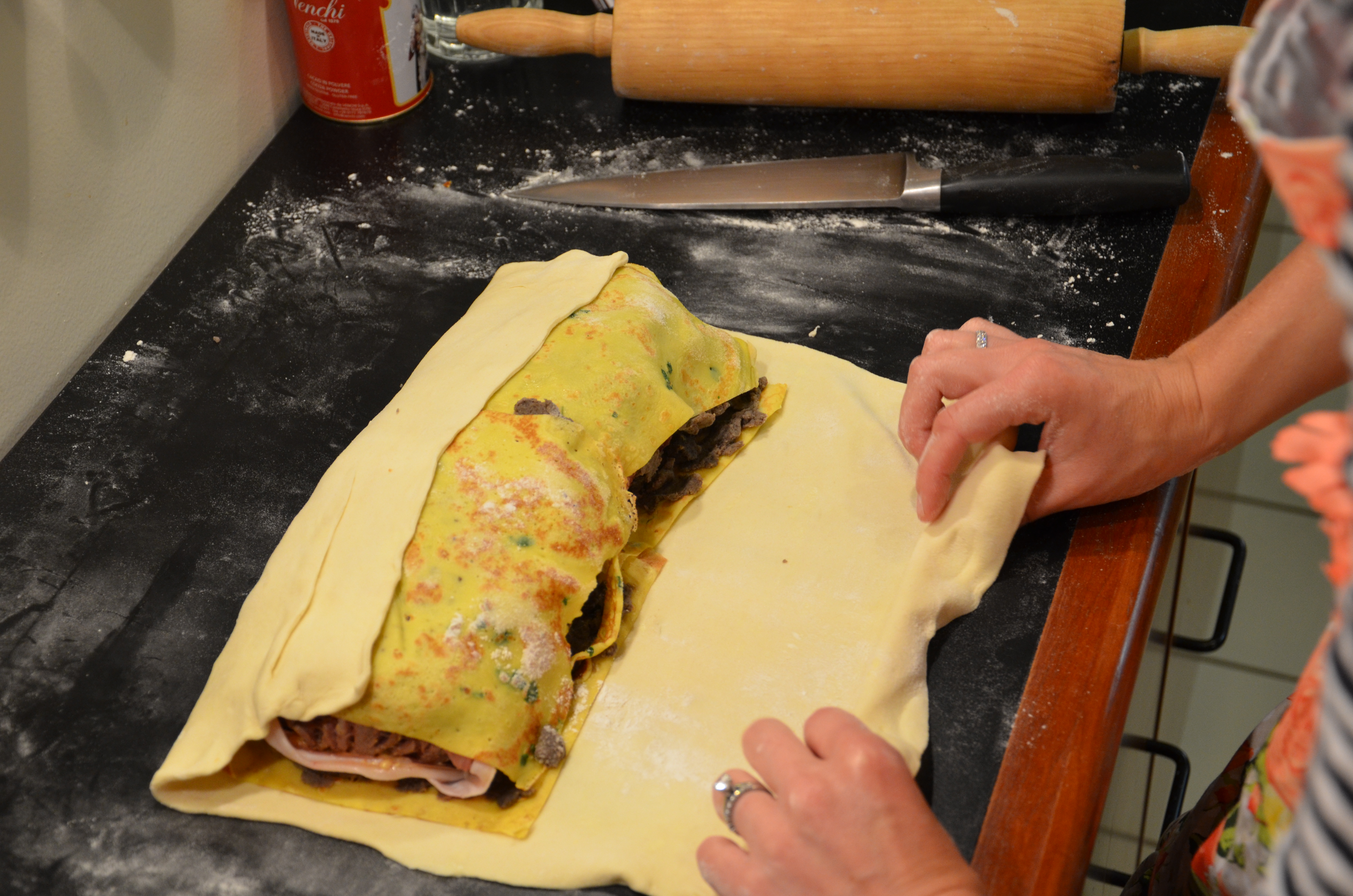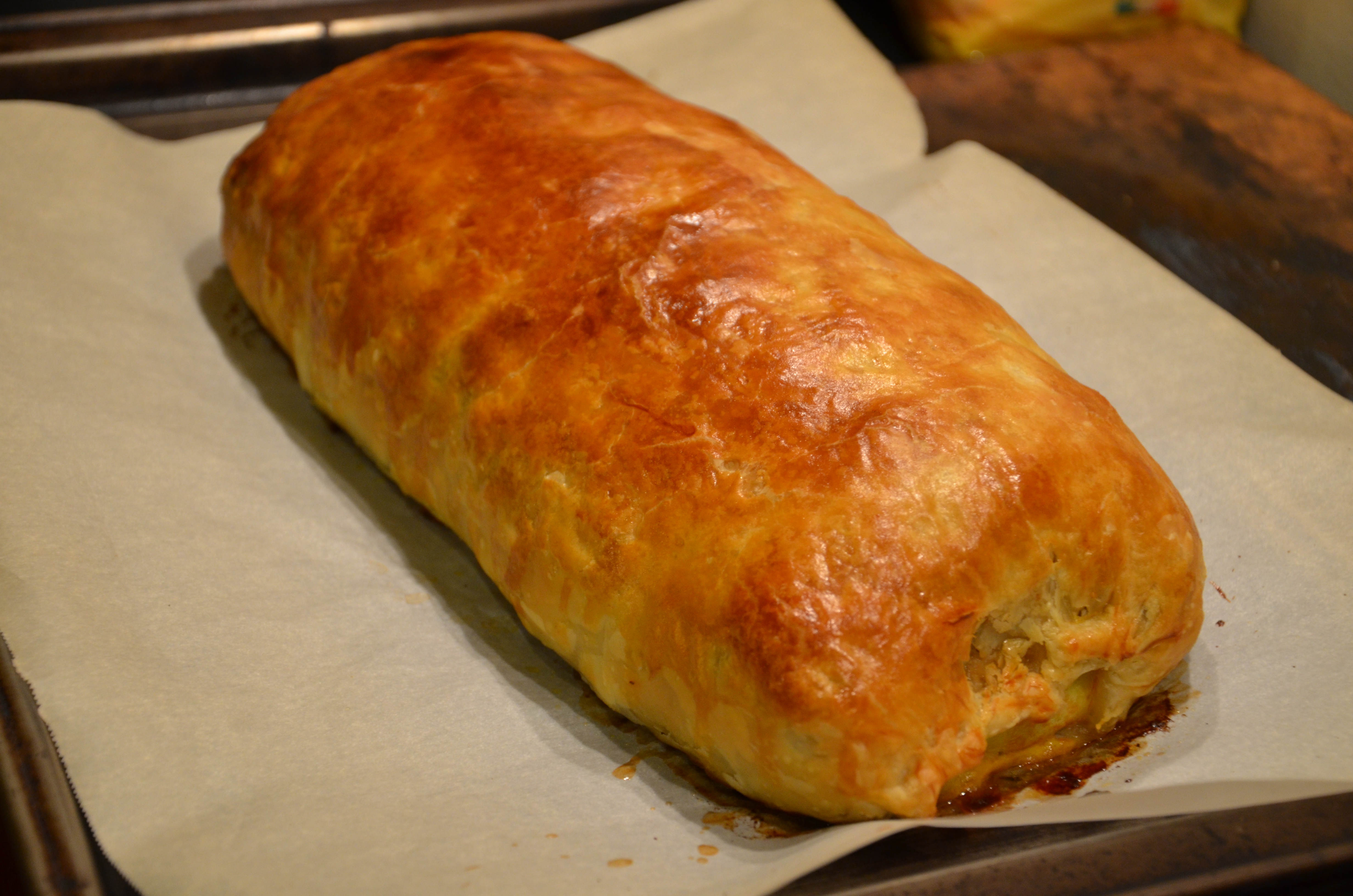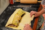 - Finally, lay the log on top of a sheet of puff pastry rolled to 1/4″ thin. Again, trim any excess pastry away to minimize overlap along the under seam.