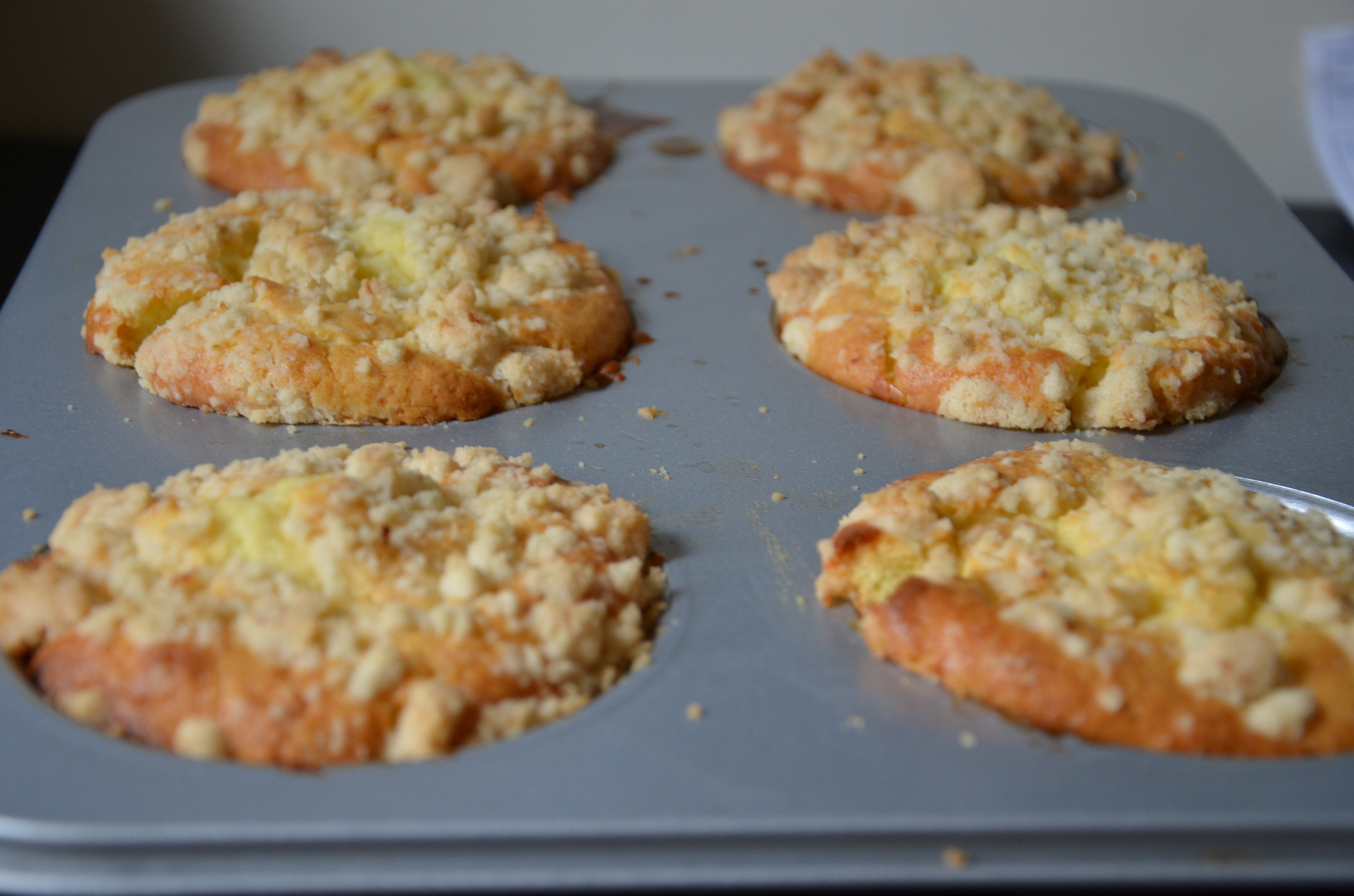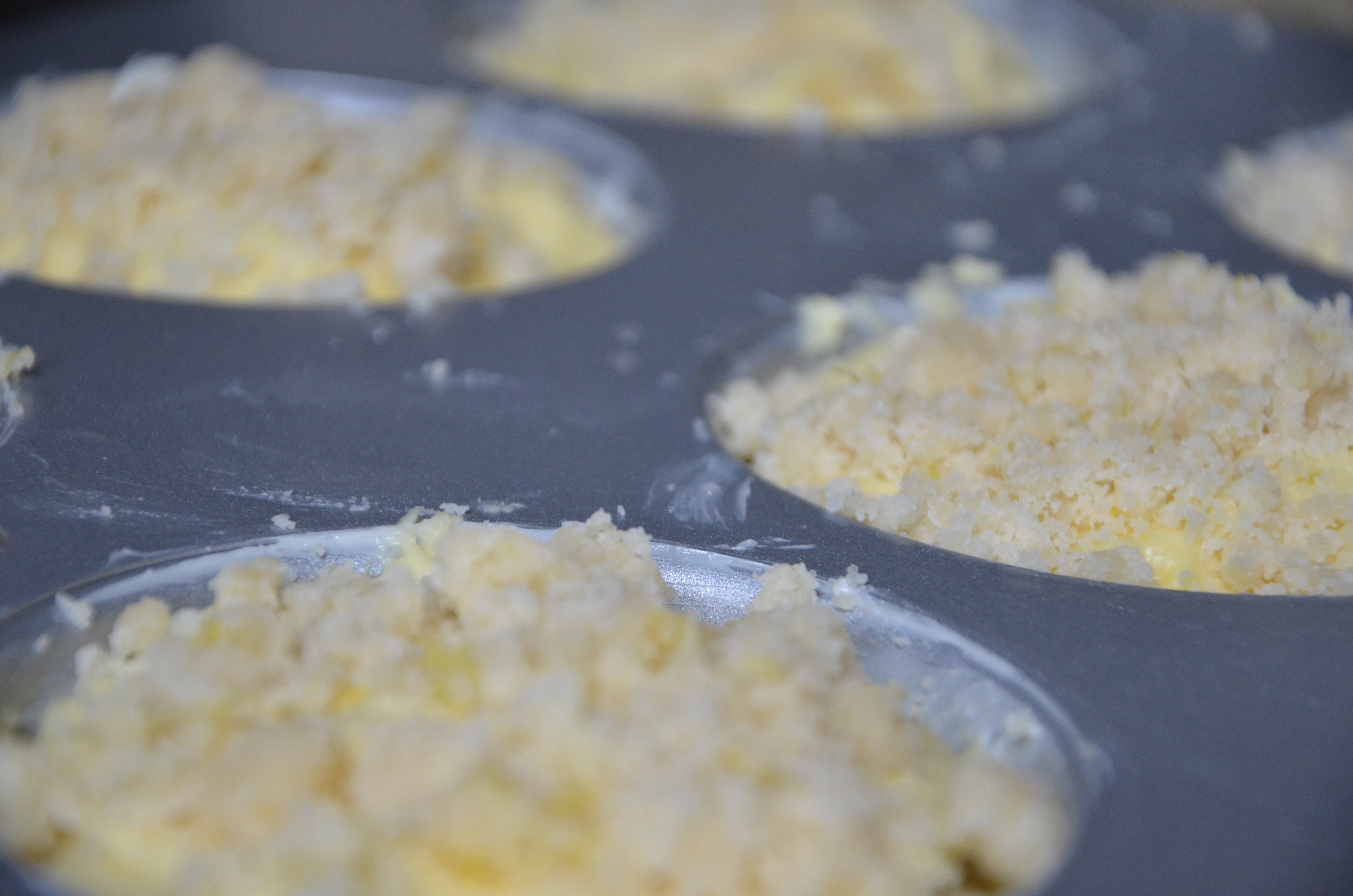 - Place 1 layer of rhubarb in the bottom of the muffin tin. Add approx 1/2 cup of cake batter and top with a solid layer of lemon zest crumble.