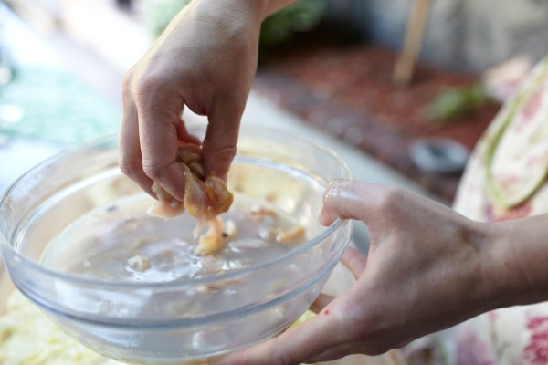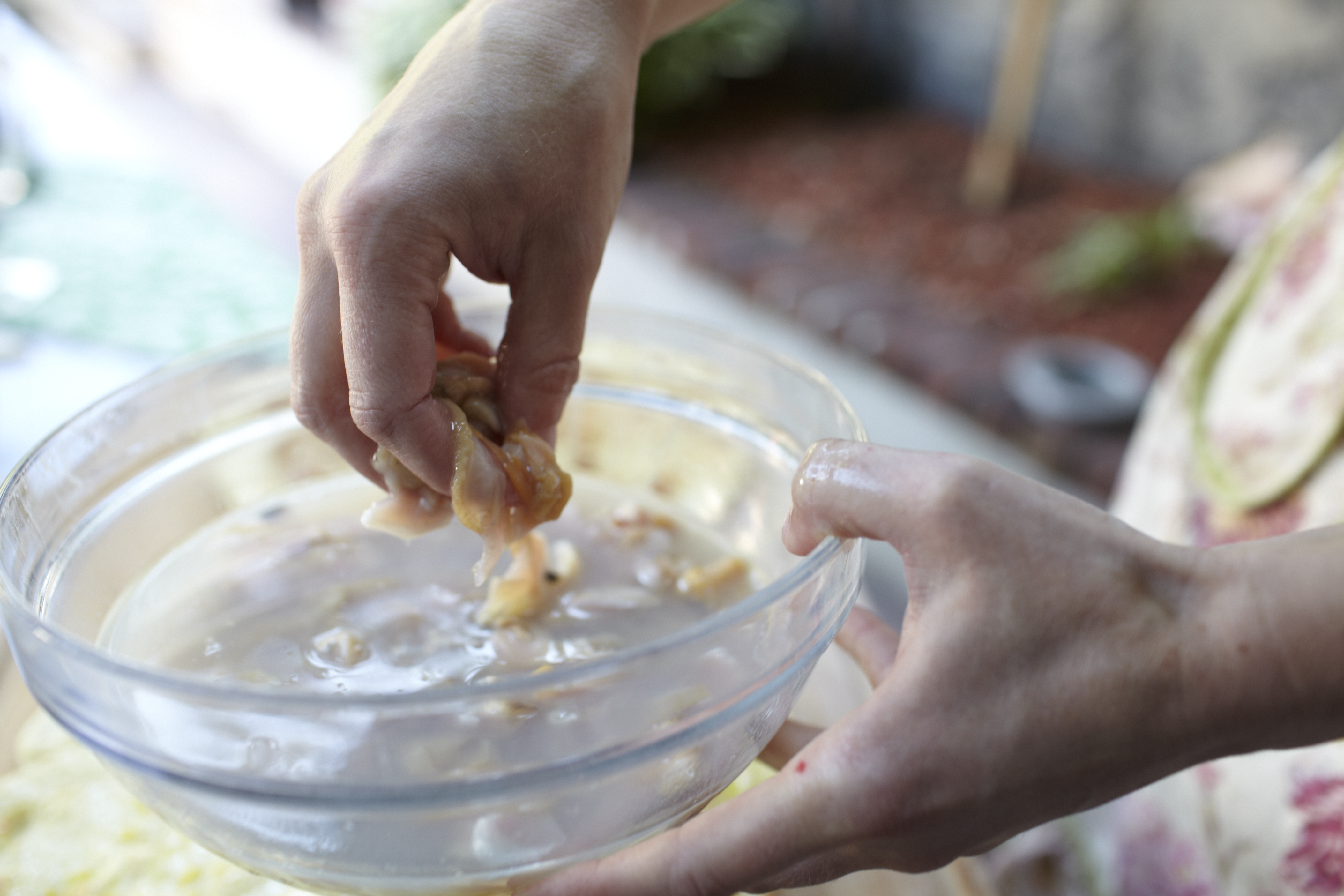 - Shuck clams, rinsing shell thoroughly before you open. Reserve clam meat and juice in a bowl. Use kitchen shears to coarsely chop meat. I like pieces to be about the size of a nickel.