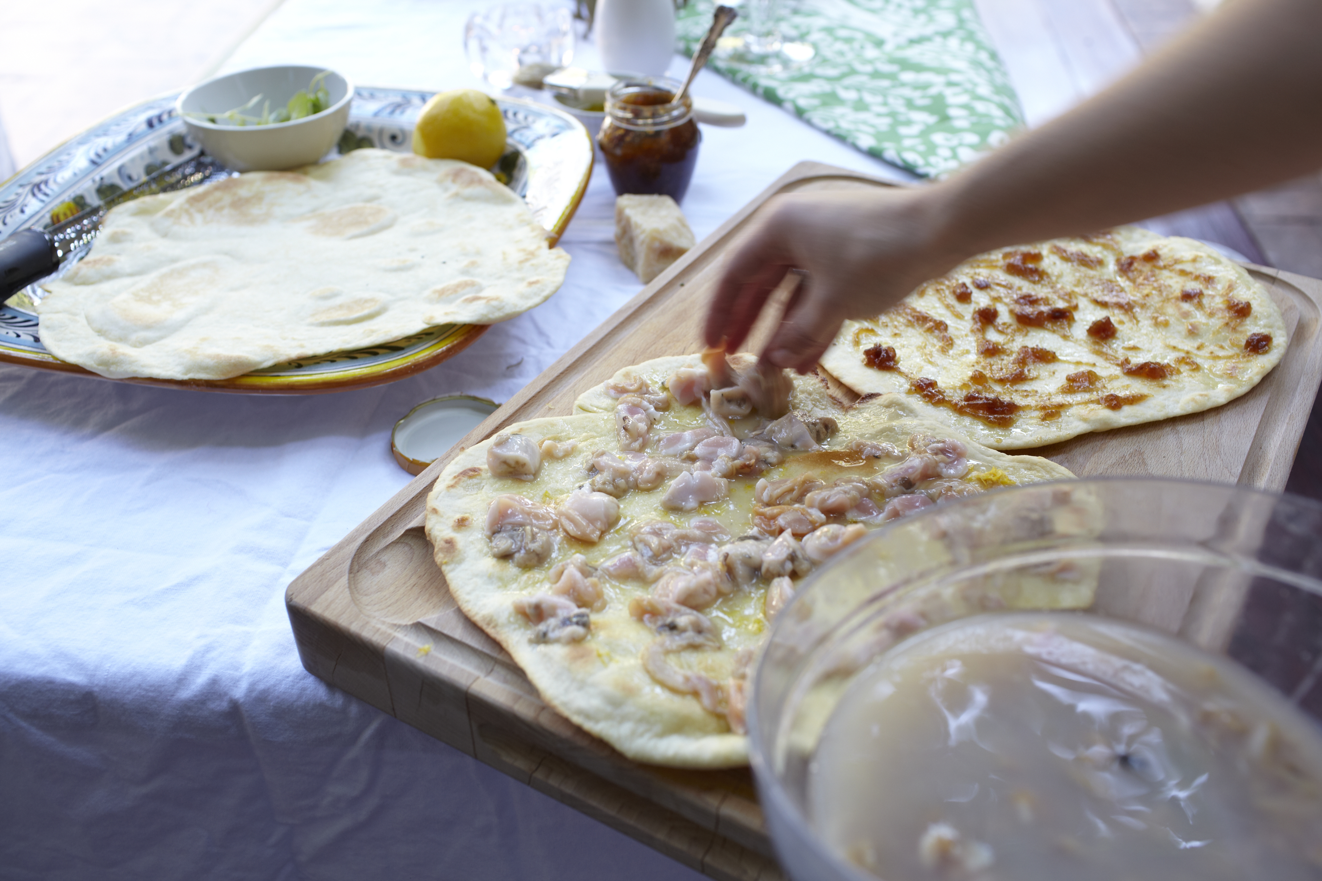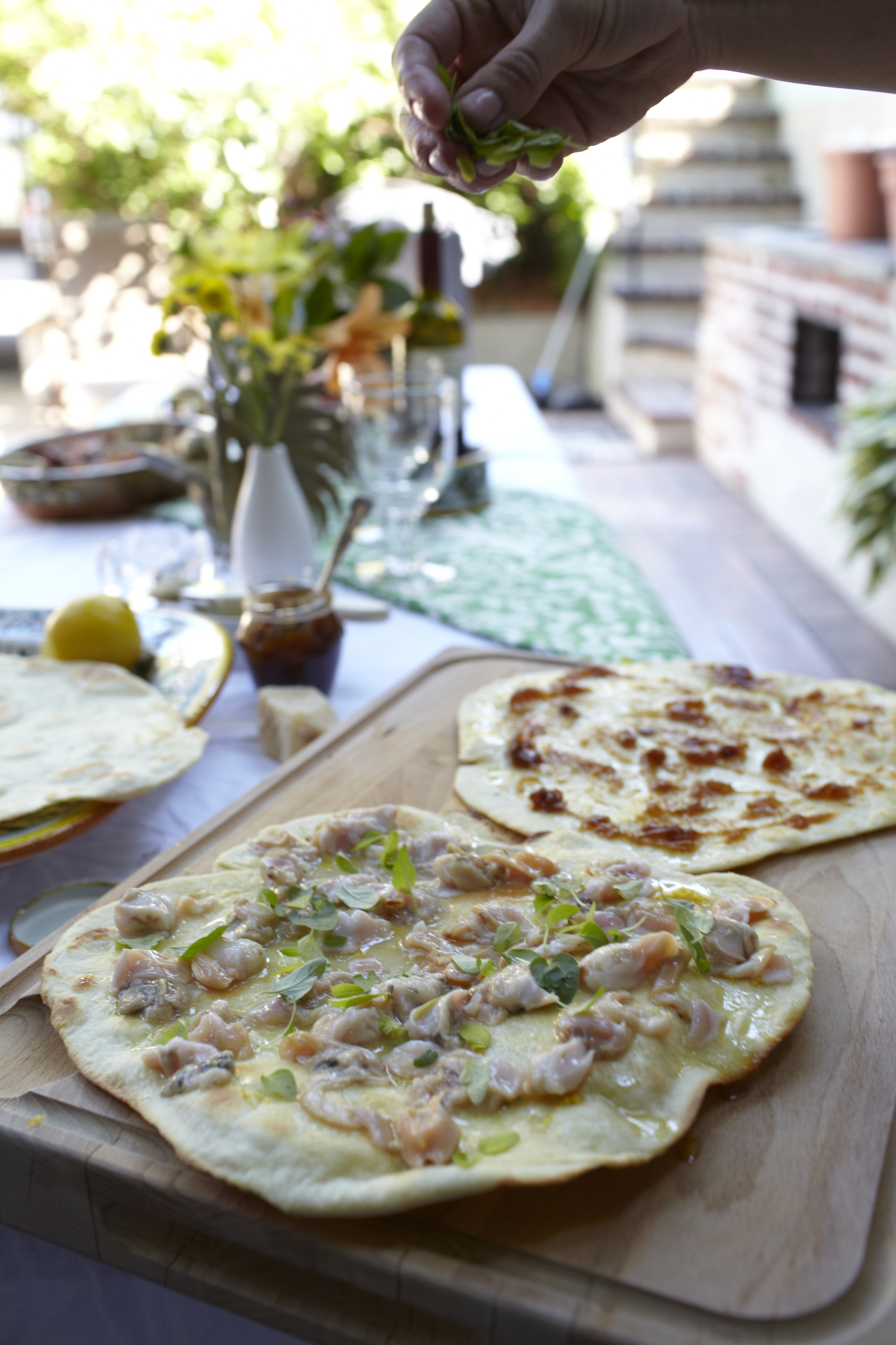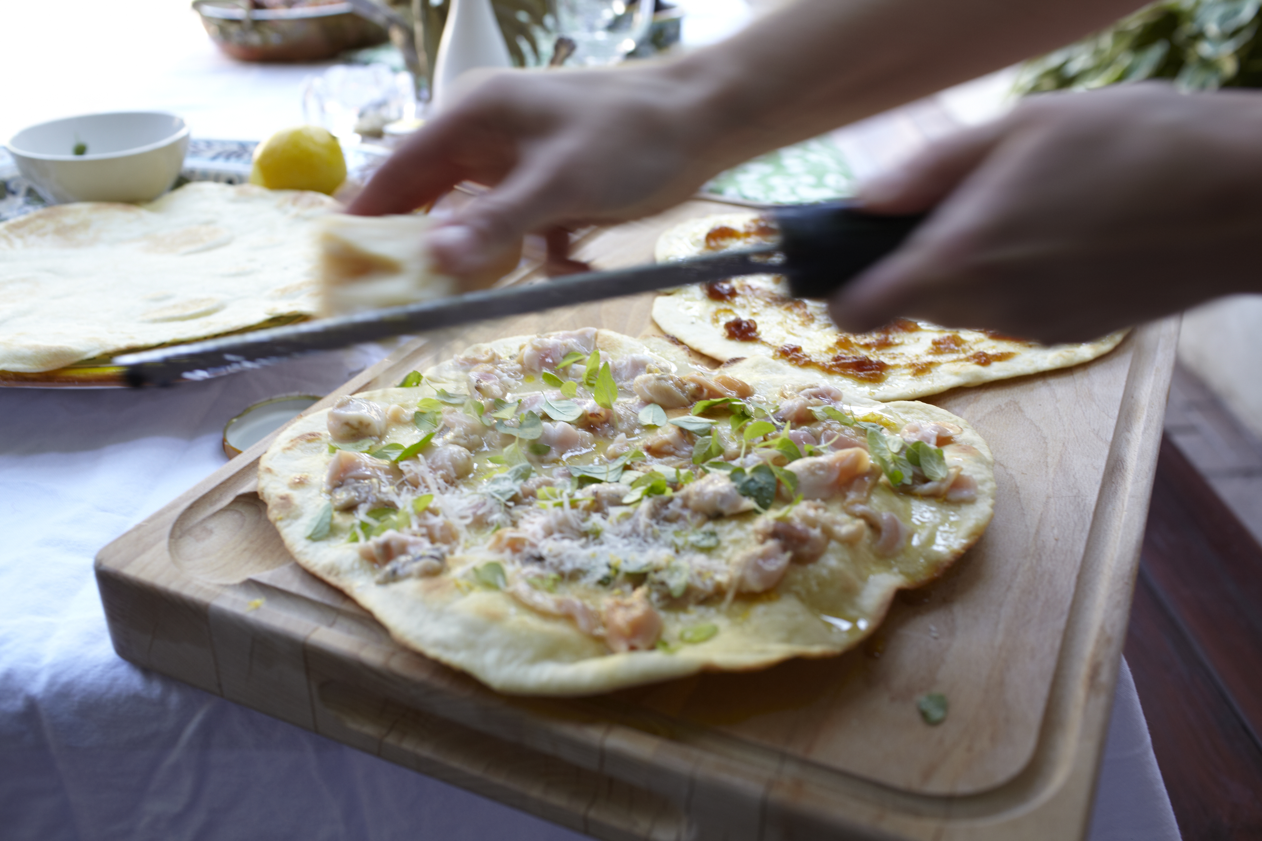 - Baste flash baked dough with garlic and lemon zest infused olive oil