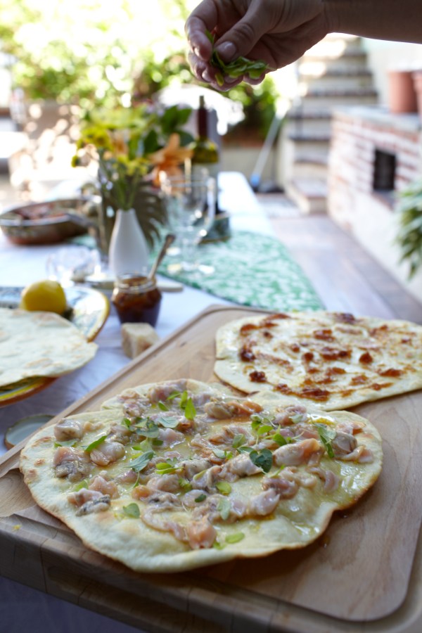 Here she is… This White Clam Pizza is about to go National!!! I will be preparing this classic New England Pizza for Gordon Ramsay, Joe Bastianich and Graham Elliot as my Signature Dish on the premiere of MasterChef USA/FOX tonight and tomorrow night, June 4th and 5th at 9pm on FOX. My hope is to give the guys a (stunning) bite of AJ’s and my life style….clean and honest. We like to keep things simple and celebrate the seasonal flavors of New England. Basically, this is what we would serve you if you were coming over to our home for a summer brunch! The original inspiration for the White Clam Pizza comes from Pepe’s in New Haven, CT. AJ and I have made this dish our own over the last 6 years, taking inspiration from clamming at Sandy Point in Connecticut and our window sill herb garden…this pie is far from ordinary and yet another labor of love. From start to finish, including the dough, this will be ready to serve in under an hour. Hopefully the rustic charm and bright flavors will set me apart from the other 99 Best Home Cooks in America, fingers crossed! (Spoiler alert: Here’s what the judges had to say!)