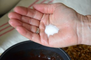 • Remove from heat and stir in sugar until granules begin to dissolve.  Stir in eggs.  Add vanilla and salt.