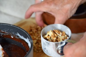 • Gently fold in flour.  Do not overmix.  Add walnuts  and pour batter into baker.