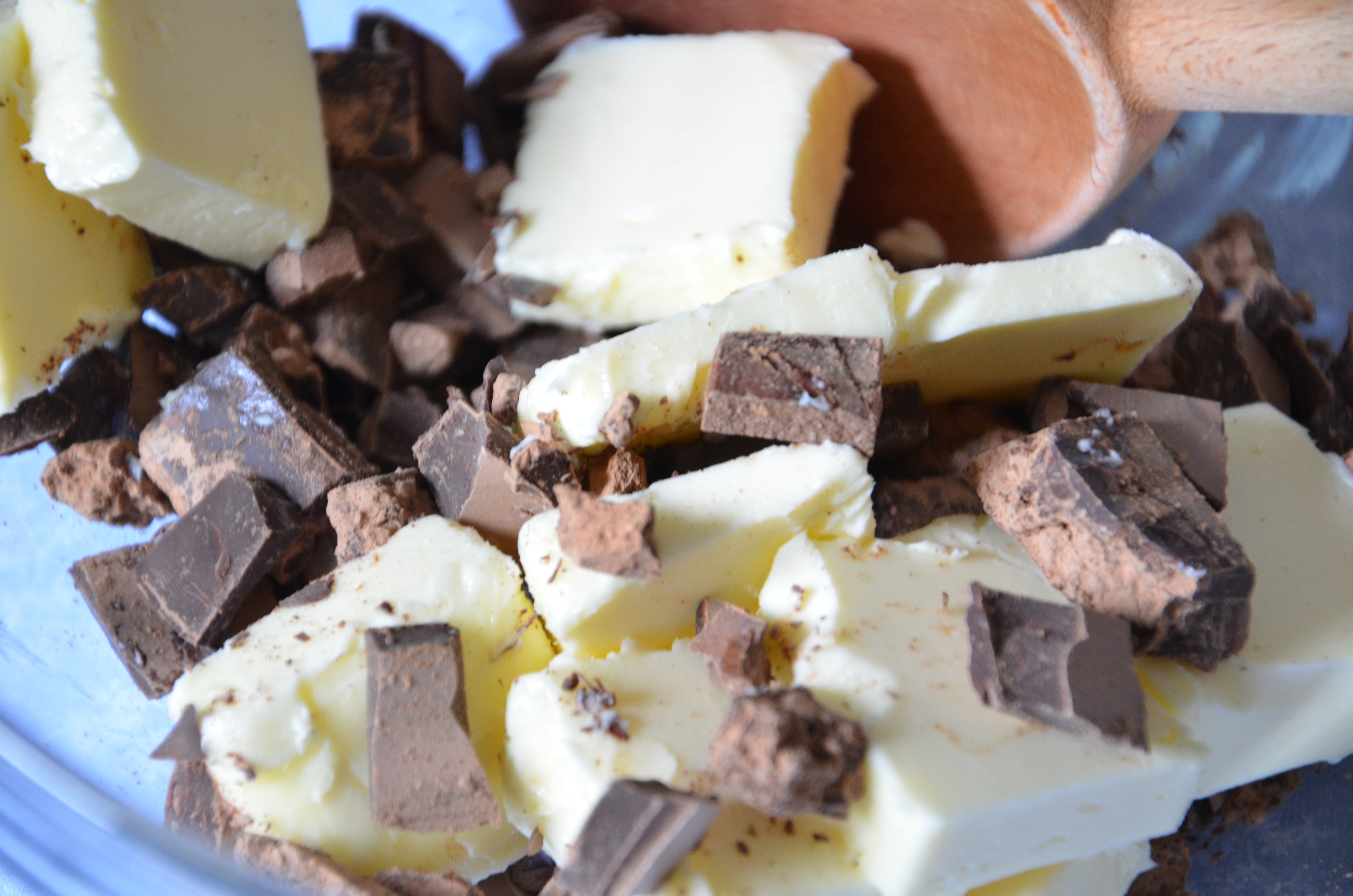 - Combine butter and chocolate in double boiler over simmering water. Remove just before chocolate as completely melted. Continue stirring off heat until texture is flawlessly smooth