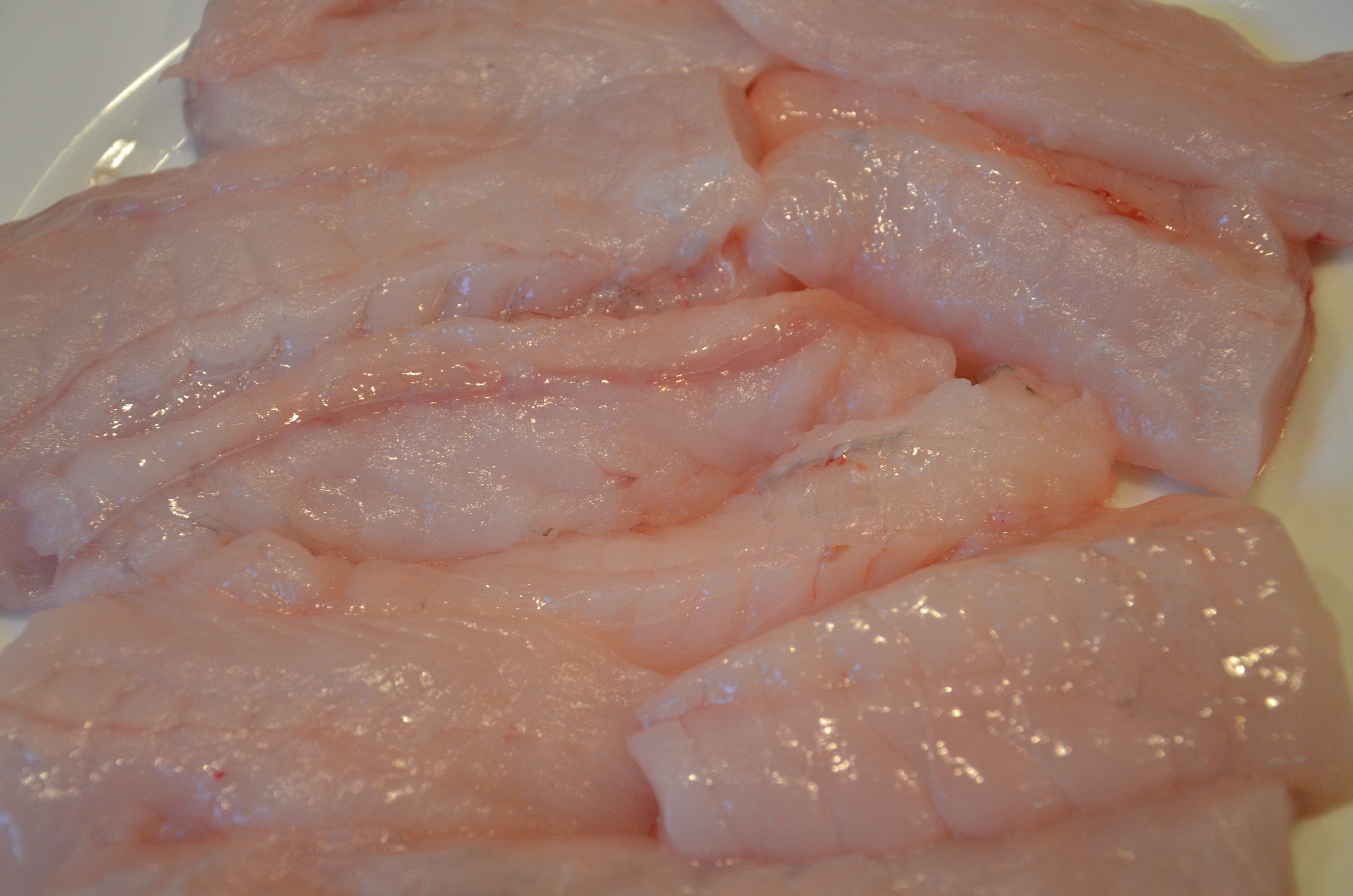 Monkfish, or  “poor man’s lobster”, came in our Cape Ann Fresh Catch CSF this week!  Monkfish are opportunistic feeders and have a sweet tooth for shrimp, shellfish and sand eels.  The flavor  is rich, sweet and succulent reminiscent of lobster, without the hassle of a shell.  The texture of the meat is more firm than flaky.  *Personally, I am amazed that such a prehistoric looking fish contains such a sweet and buttery flavor.   Have you seen a monkfish face before?!  Yikes!*  Speaking of which, Cape Ann was kind enough to spare us the heads, as they are HUGE.  The share included 3 gorgeous tails, ready for a quick filet before they hit the pan.