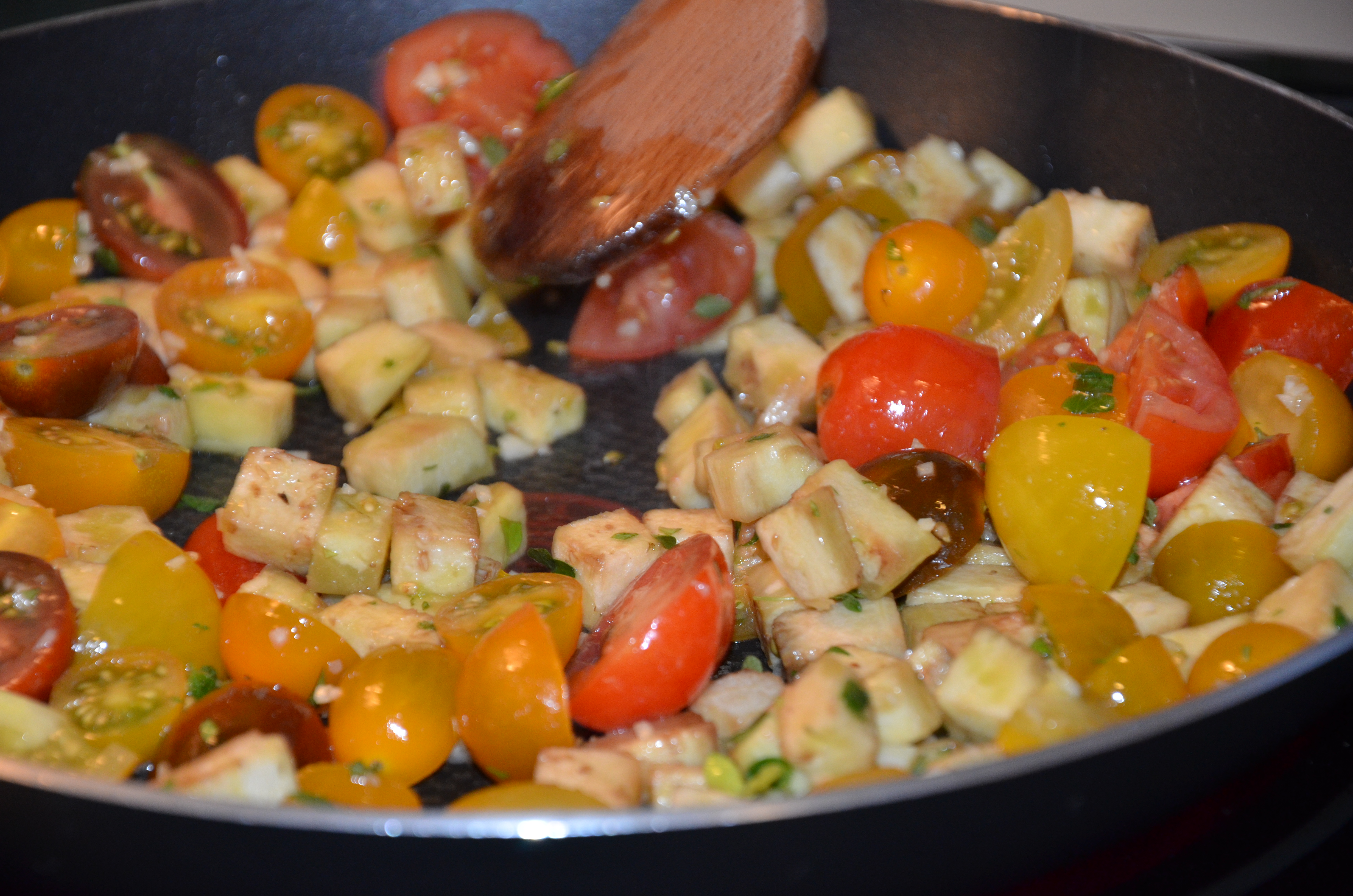 • On stovetop, put Olive oil in a non-stick pan with Garlic, begin to heat. Add Eggplant and Plum Tomatoes (best if Tomatoes face down on the cut side), then Oregano and Thyme. gently stir.