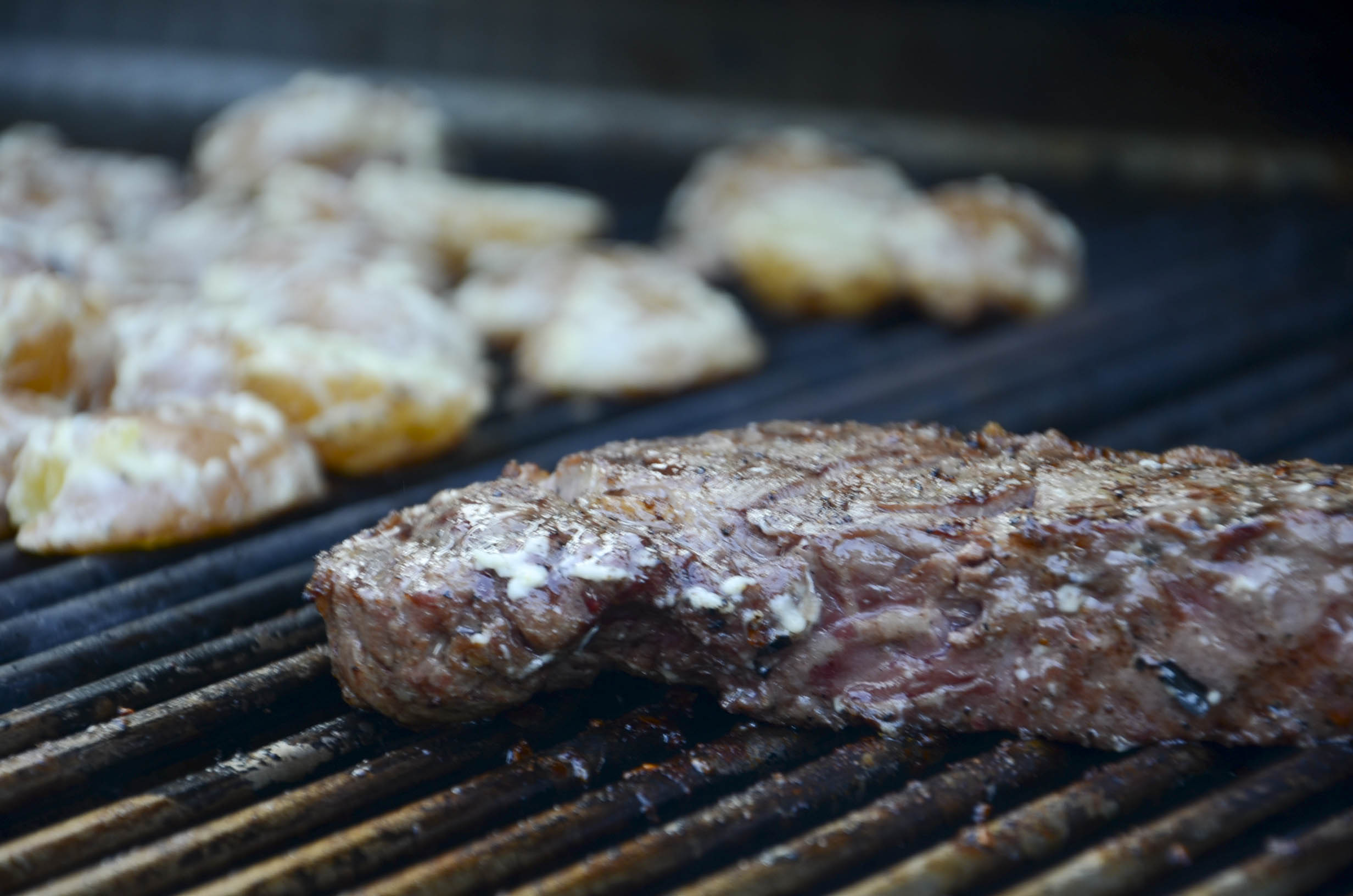 Grilled Strip Steak with Tarragon Orange Shallot Compound Butter and Grilled Potatoes with Crumbled Bacon Vinaigrette.