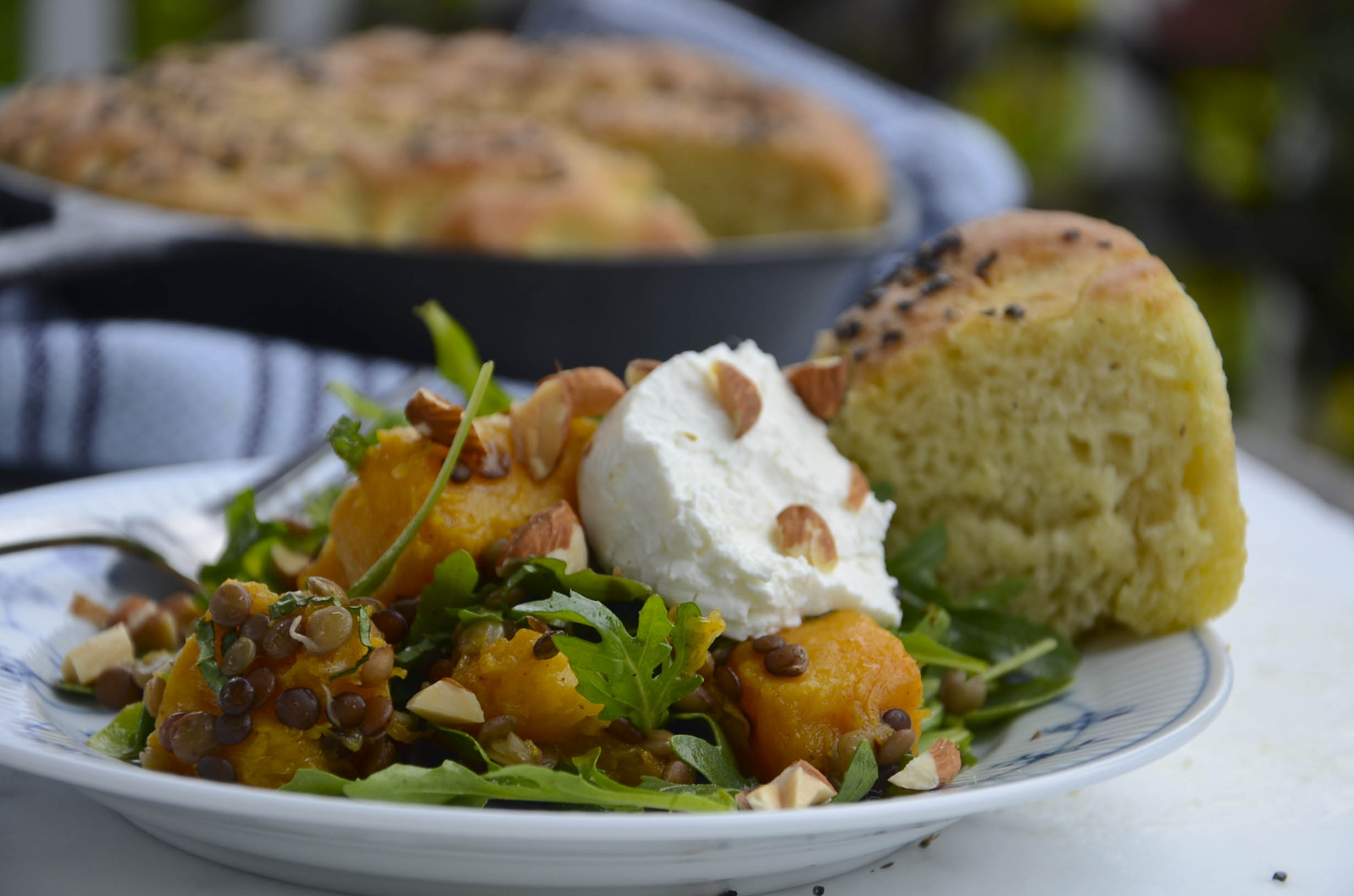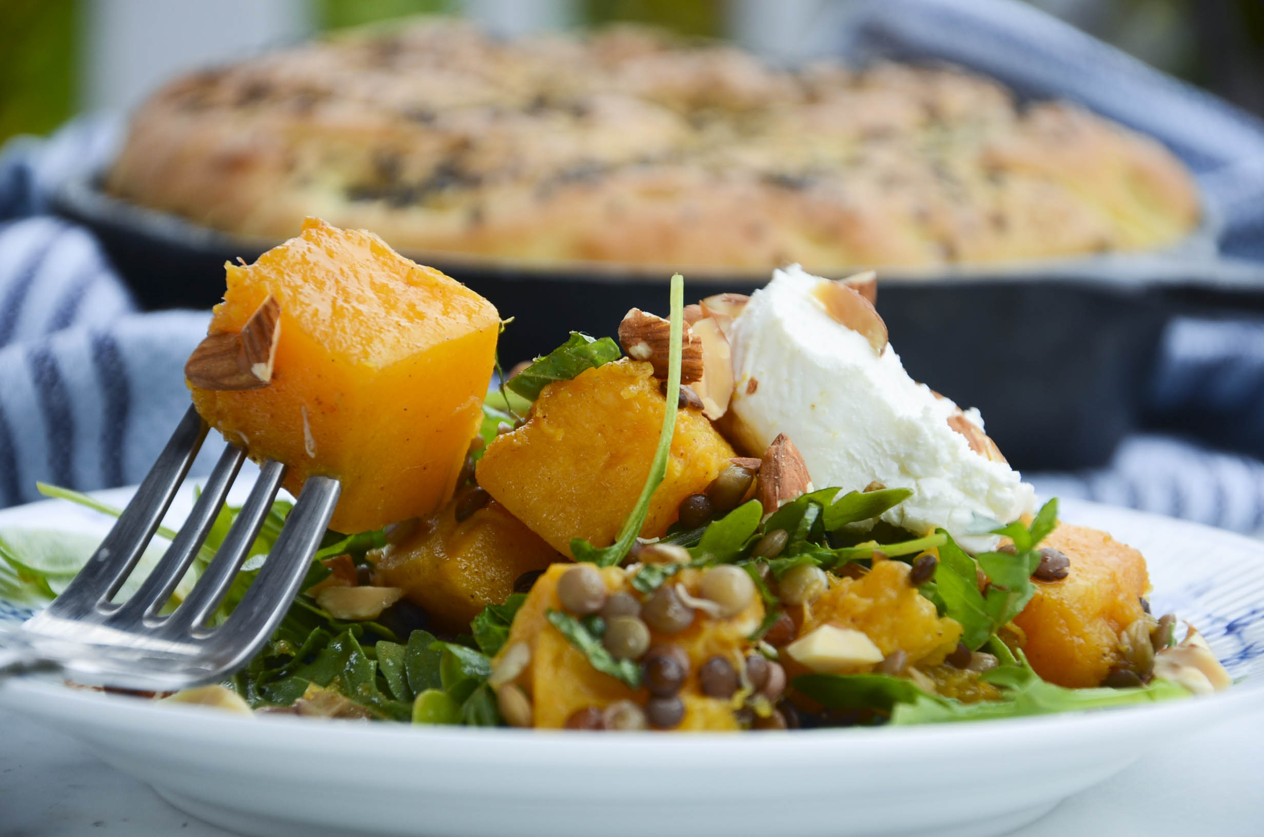 This hearty salad is a nod to fall, from here in New England to travels along the Mediterranean. The creamy butternut squash is roasted with aromatic cumin, sweet paprika and the goodness of Olivio’s Extra Virgin Olive Oil then tossed with hearty lentils, refreshing mint and an earthy goat cheese which balances out the exotic. Toasted almonds add the perfect crunch and a splash of red wine vinegar brings everything together over a bed of spicy arugula. Grab a hunk of home-made focaccia and a glass of Rioja, pretty please! Let’s sit down and toast to yet another successful harvest.