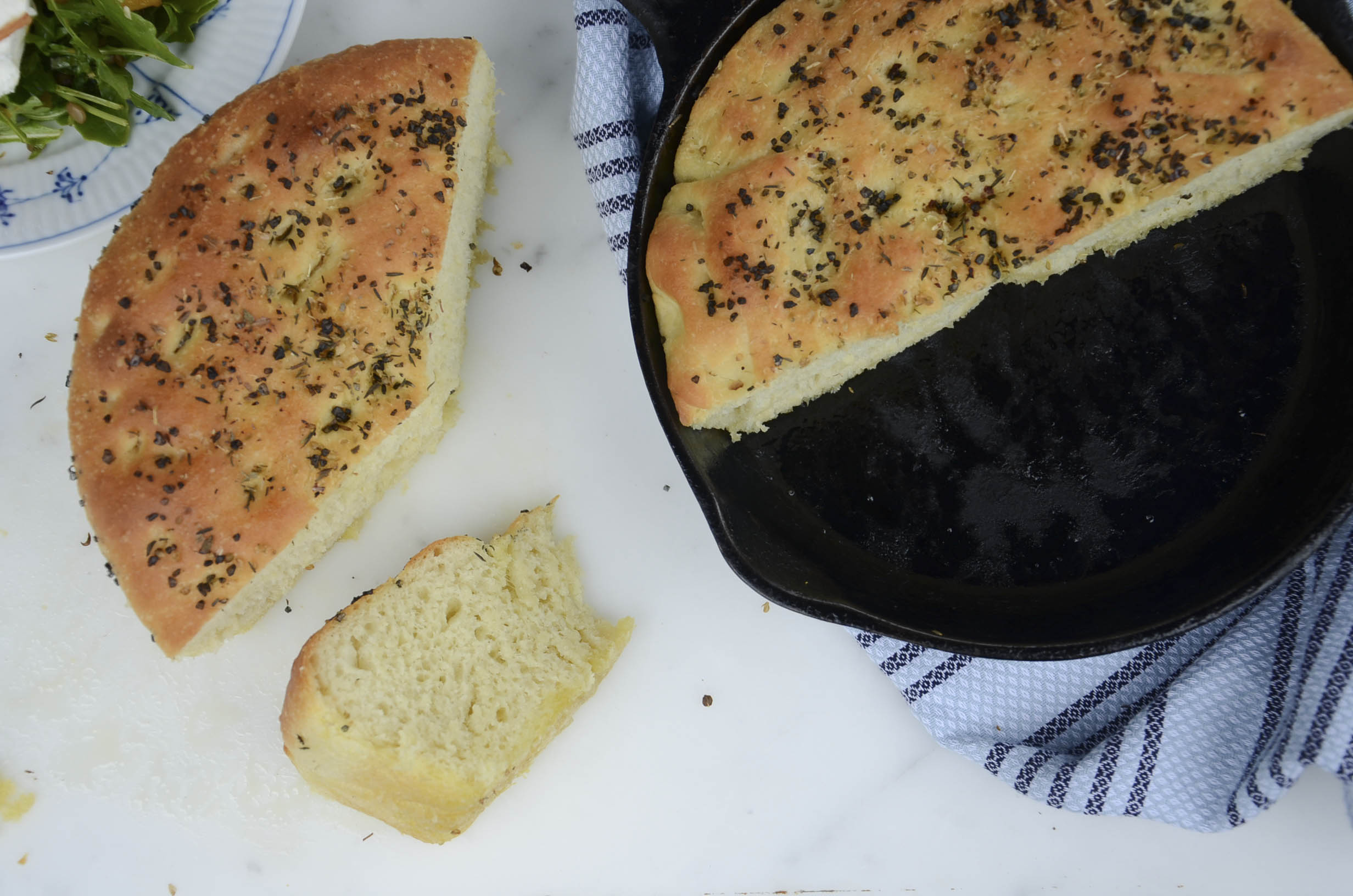 - After dough has risen, punch down and knead 1-2 minutes until you no longer hear or feel air bubbles popping. Pour remaining 1/2 cup EVOO into a 12″ cast iron skillet. It is the Olive Oil that gives focaccia the awesome flavor and crust. The more the better:) Add dough ball and using your hands, pull, stretch and press dough to fill the skillet. Flip once. When the dough has been fitted, use your fingers to dig holes all the way through the dough until you reach through to the skillet. Don’t worry- when the dough rises the second time the holes will mostly fill. But you must be extreme if you want to maintain some texture. The texture is what makes this bread awesome for sopping up the flavor of what ever you pair it with.