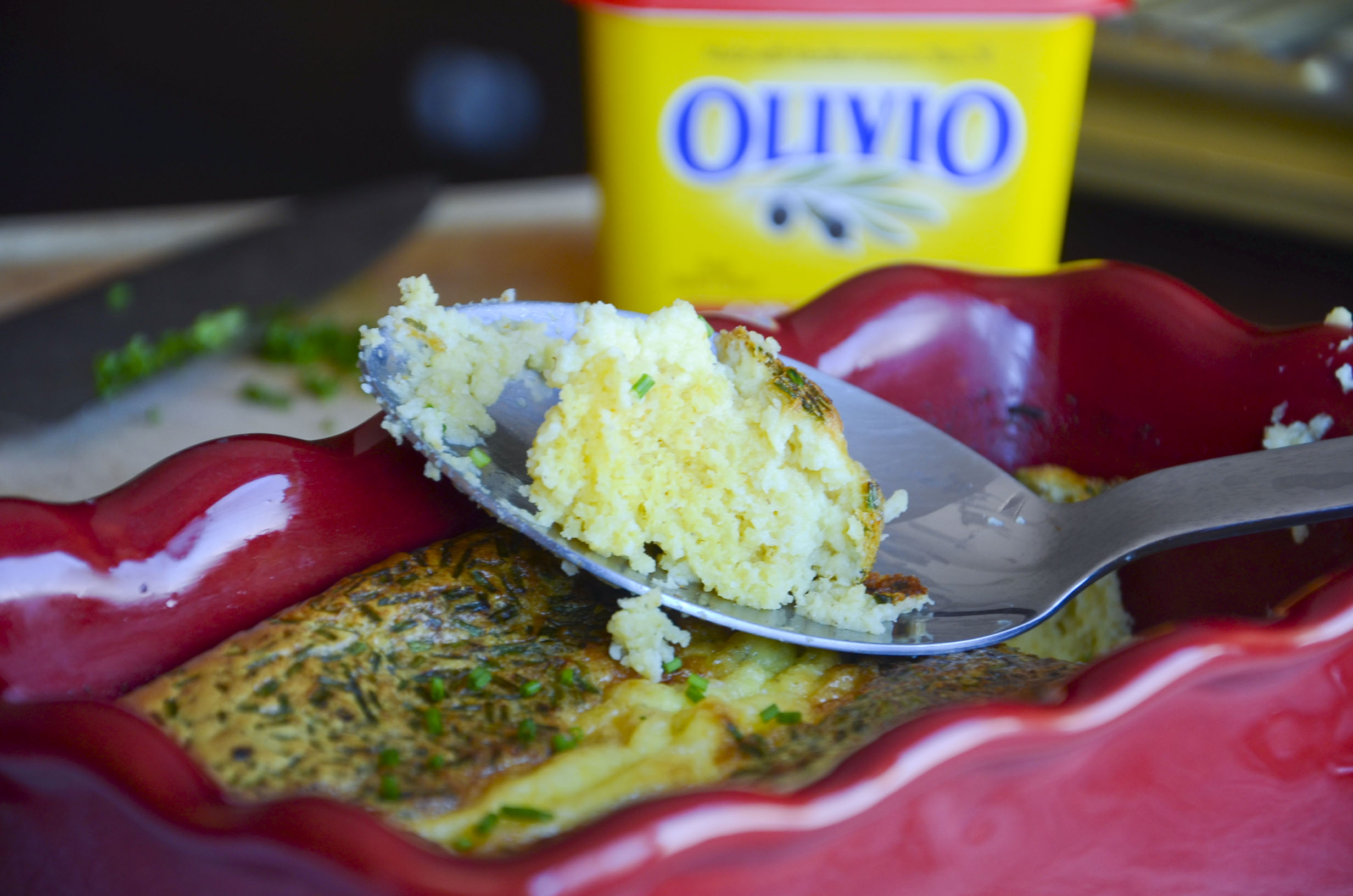 Part savory custard,  part polenta, think of this as “Soufflé Americana”.  Delicious and hearty, the corn meal is wonderful staple of the season.  The chives and buttermilk brighten this nostalgic side and the goodness of Mediterranean Olive Oil in the Olivio Buttery Spread keep your heart health in mind.  Now that is something to be thankful for:) Spoon this bread directly from the baker to your plate for a delicious Thanksgiving side that will belly up beautifully to your turkey and gravy!